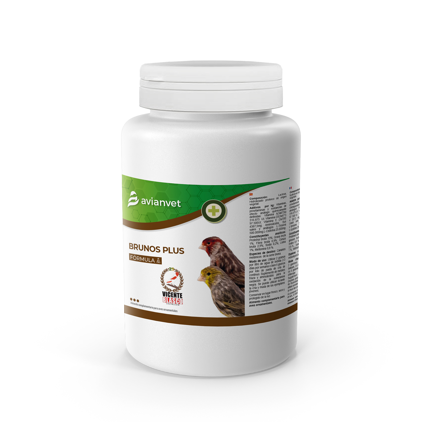 Brunos Plus Avianvet es un suplemento nutricional desarrollado por Aviantecnic en colaboración con el criador y juez OMJ Vicente Blasco. Está formulado para potenciar la pigmentación y fortalecer el plumaje en canarios brunos y otras especies melánicas, así como cubrir las necesidades de los canarios melánicos brunos durante la cría, la muda y el desarrollo juvenil.