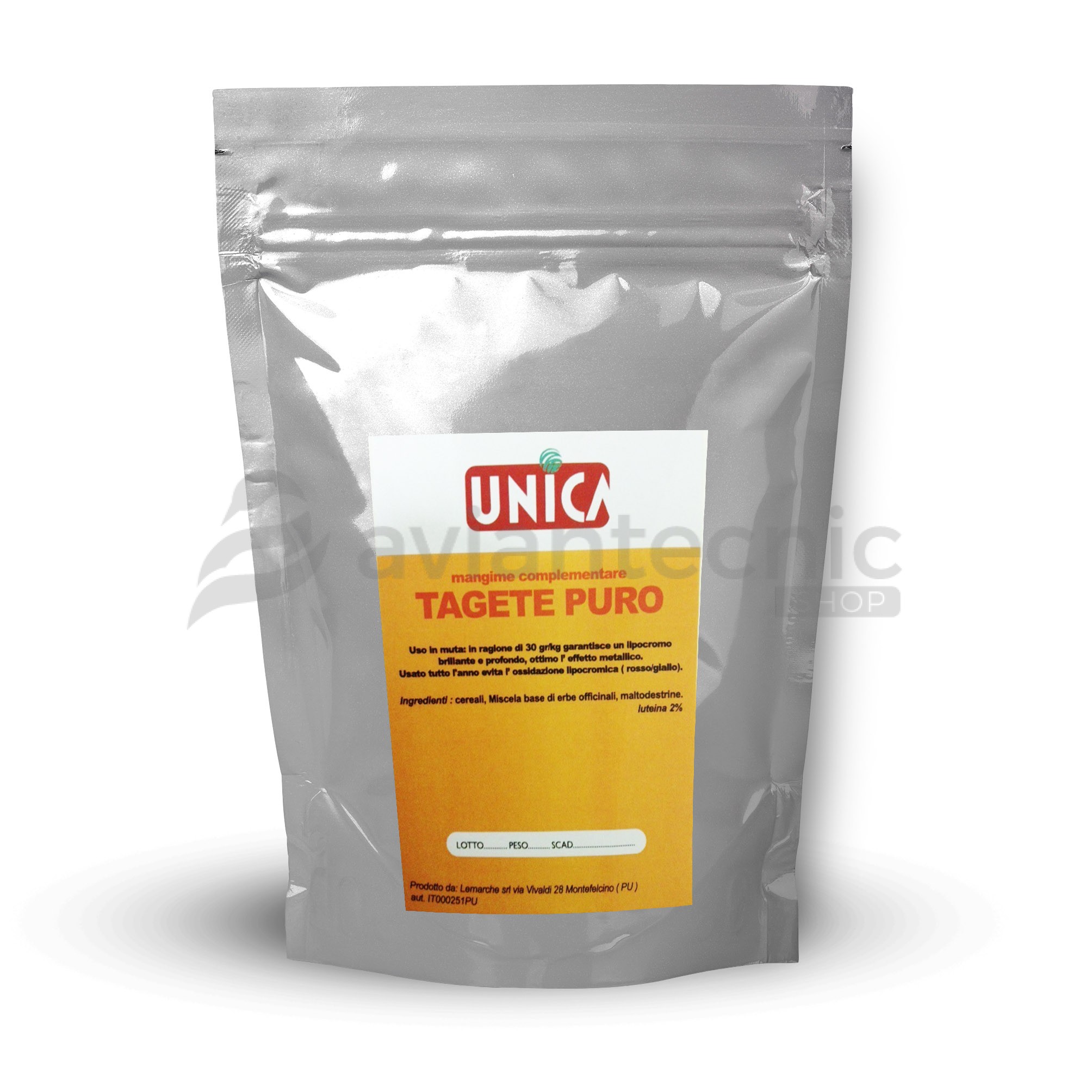 Tagetes Unica está compuesto por pétalos de Caléndula erecta de la variedad naranja, sobre una base mineral (micro y macroelementos), cereales. Rico en xantofila (luteína) y zeaxantina con 2% de luteína.