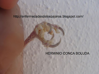 La sarna está causada por ácaros de la familia de los sarcóptidos. Estos ácaros ejercen una acción patógena lenta y suelen aparecer alrededor del pico y patas. Los ambientes sucios, el estrés y la avitaminosis A, favorecen su aparición. Aún suelen verse casos tan extremos como este y es muy común ver algunos aviarios donde los ejemplares jóvenes presentan las patas como envejecidas.